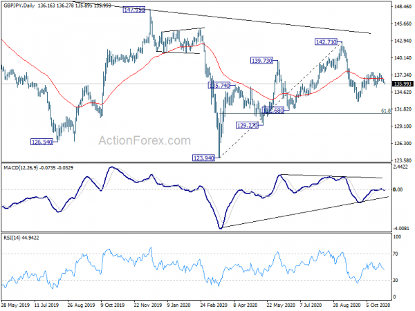 Intraday bias in GBP/JPY remains neutral first. On the upside, break of 137.83 will extend the rebound from 133.03. Intraday bias will be turned back to the upside for retesting 142.71 high. On the downside, break of 135.05 will argue that decline from 142.71 is resuming. intraday bias will be turned back to the downside for 133.03, and then 61.8% retracement of 123.94 to 142.71 at 131.11.