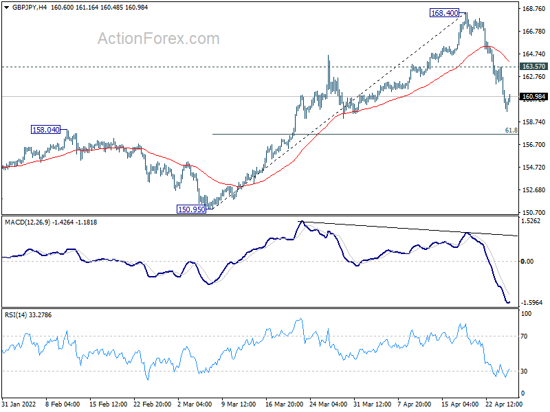 GBP/JPY’s fall from 168.40 is still in progress and could extend to 61.8% retracement of 150.95 to 168.40 at 157.61. Strong support is expected there to contain downside to bring rebound. On the upside, break of 163.57 minor resistance will turn bias back to the upside for retesting 168.40 high. However, firm break of 157.61 will bring deeper fall to 150.96 structural support.