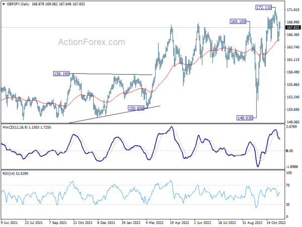 GBP/JPY is staying in consolidation from 172.11 and intraday bias remains neutral. Further rally is mildly in favor with 164.95 support intact. On the upside, break of 172.11 will resume larger up trend. However, break of 164.95 will bring deeper pull back to 159.71 support and below.