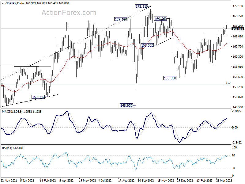 GBP/JPY’s rise from 155.33 extended higher last week but formed a temporary top at 167.95 and retreated. Initial bias remains neutral this week first, and further rise is in favor as long as 165.38 support holds. On the upside, break of 167.95 will resume the rebound from 155.33 to 169.26 resistance. However, firm break of 165.38 will argue that the corrective pattern from 172.11 is starting another falling leg. Intraday bias will be back on the downside for 162.75 support and below.