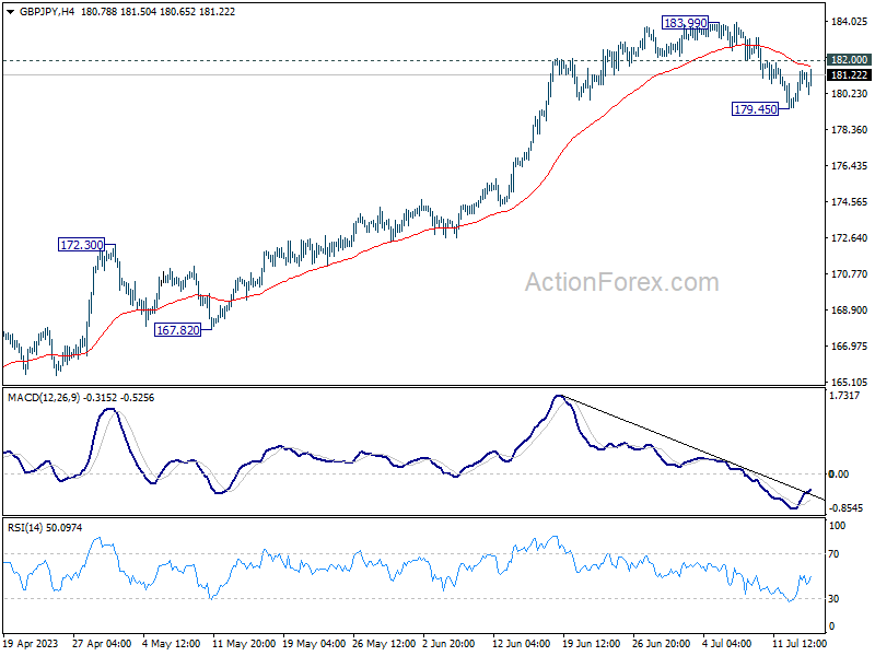 Intraday bias in GBP/JPY remains neutral at this point. Further fall remains in favor, and break of 179.45 will target 55 D EMA (now at 176.65). On the upside, above 182.00 minor resistance will turn bias to the upside for retesting 183.99 high instead.