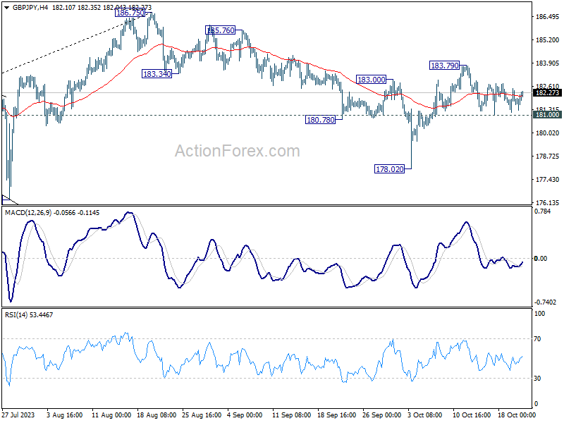 GBP/JPY stays in sideway trading below 183.79 last week and outlook is unchanged. Initial bias remains neutral this week first. The favored case is still that correction from 186.75 has completed at 178.02. Above 183.79 will resume the rise from 178.02 to retest 186.75 high. However, break of 181.00 will dampen this view, and turn bias back to the downside for 178.02 instead.