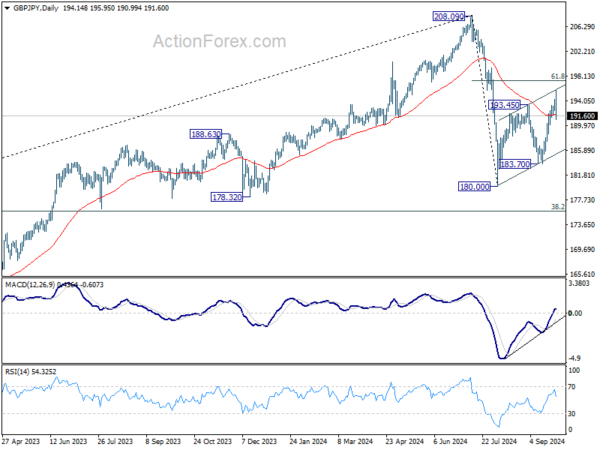 Intraday bias in GBP/JPY is turned neutral first with current sharp retreat. ON the upside, above 195.95 temporary top will extend the corrective rebound from 180.00 to 61.8% retracement of 208.09 to 180.00 at 197.35 next. However, firm break of 190.11 will argue that this correction might have completed, and turn bias back to the downside for 183.70 support next.