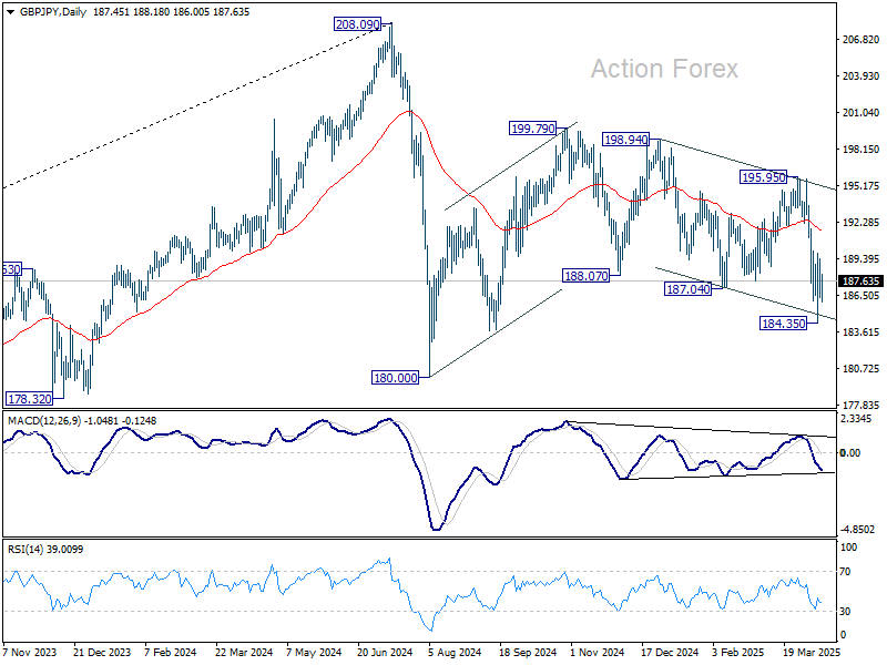 GBP/JPY’s decline from 199.79 resumed last week and fell to 184.35, but then recovered. Initial bias stays neutral this week first and some more consolidations would be seen. Risk will stay on the downside as long as 190.06 resistance holds. Below 184.35 will target 180.00 low. Nevertheless, break of 190.06 will turn bias back to the upside for stronger rebound.