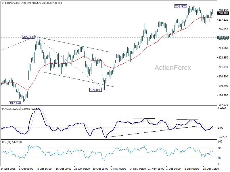 Range trading continues in GBP/JPY below 208.92 and intraday bias stays neutral. Further rally is expected as long as 205.17 support holds. On the upside, break of 208.92 will resume larger up trend and target 61.8% projection of 184.35 to 205.30 from 199.04 at 211.98 next.