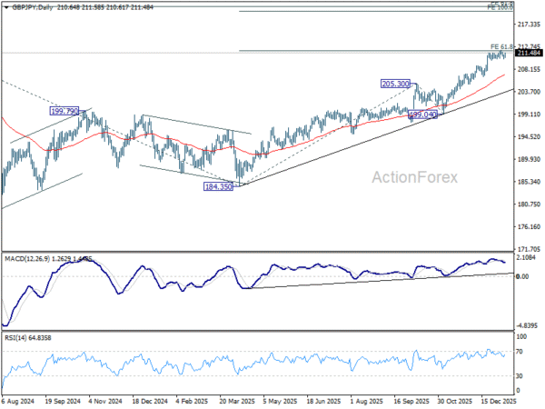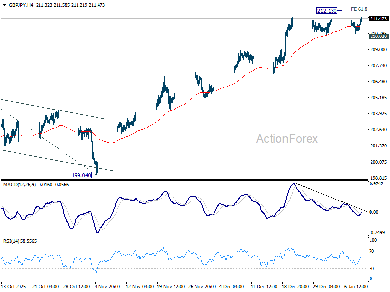 Intraday bias in GBP/JPY stays neutral at this point. Considering bearish divergence condition in 4H MACD, firm break of 210.02 support should confirm short term topping. Deeper decline would be seen to 55 D EMA (now at 207.19) as a correction. Nevertheless, sustained break of 61.8% projection of 184.35 to 205.30 from 199.04 at 211.98 will extend current up trend to 100% projection at 219.99 next.