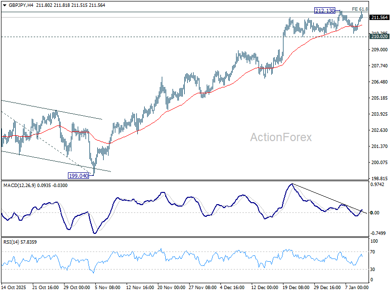 GBP/JPY stayed in sideway consolidations below 212.13 last week. Initial bias stays neutral this week first, and further rally is in favor as long as 21.02 support holds. On the upside, decisive break of 61.8% projection of 184.35 to 205.30 from 199.04 at 211.98 will extend current up trend to 100% projection at 219.99 next. Nevertheless, firm break of 210.02 support should confirm short term topping. Deeper decline would be seen to 55 D EMA (now at 207.19) as a correction.