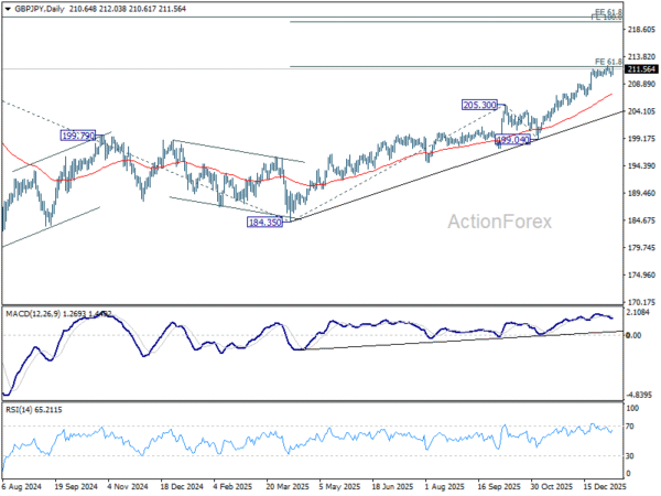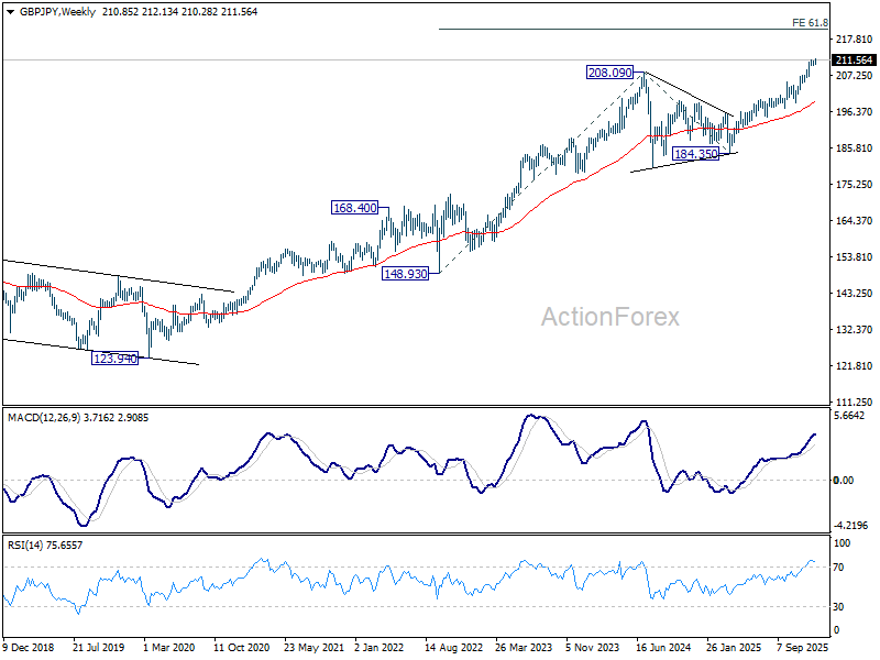 In the bigger picture, up trend from 123.94 (2020 low) is in progress. Next target is 61.8% projection of 148.93 (2022 low) to 208.09 (2024 high) from 184.35 at 220.90. On the downside, break of 205.30 resistance turned support is needed to indicate medium term topping. Otherwise, outlook will stay bullish even in case of deep pullback.
