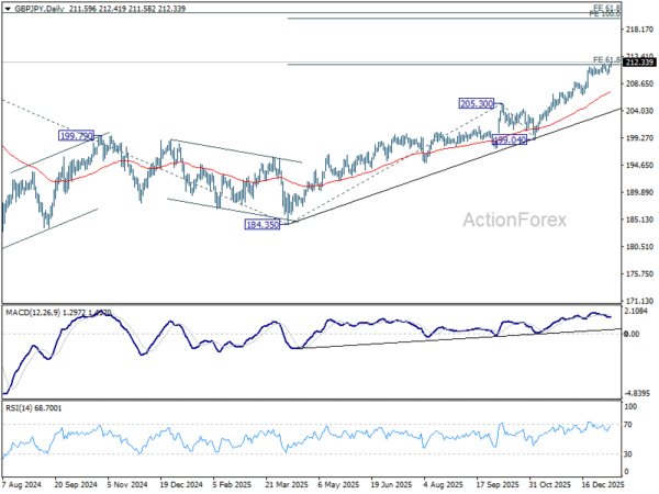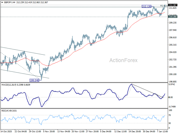 GBP/JPY’s rally resumed by breaking 212.13 temporary top and intraday bias is back on the upside. Sustained trading above 61.8% projection of 184.35 to 205.30 from 199.04 at 211.98 will extend current up trend to 100% projection at 219.99 next. For now, outlook will stay bullish as long as 210.28 support holds, in case of retreat.