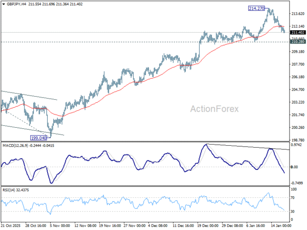 GBP/JPY edged higher to 214.27 last week but quickly retreated. Initial bias remains neutral this week and further rise is in favor. Break of 214.27 will resume larger up trend to 100% projection of 184.35 to 205.30 from 199.04 at 219.99 next. Nevertheless, considering bearish divergence condition in 4H MACD, firm break of 210.28 will confirm short term topping, and turn bias to the downside for deeper pullback to 55 D EMA (now at 207.97).