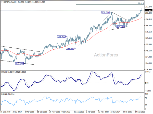 In the bigger picture, up trend from 123.94 (2020 low) is in progress. Next target is 61.8% projection of 148.93 (2022 low) to 208.09 (2024 high) from 184.35 at 220.90. On the downside, break of 205.30 resistance turned support is needed to indicate medium term topping. Otherwise, outlook will stay bullish even in case of deep pullback.