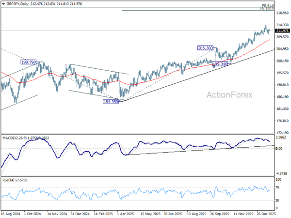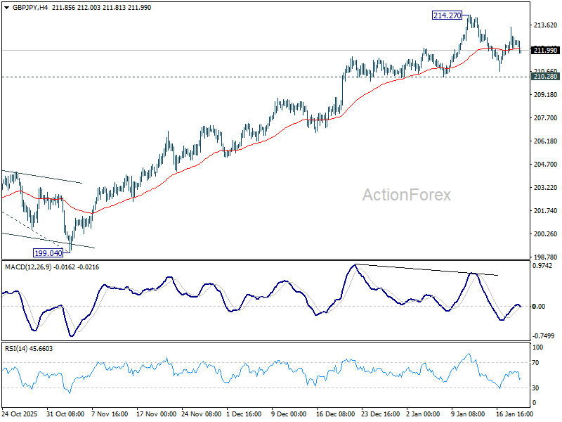 GBP/JPY is still bounded in range trading below 214.27 and intraday bias stays neutral. With 210.28 support intact, further rally is expected. On the upside, break of 214.27 will resume larger up trend to 100% projection of 184.35 to 205.30 from 199.04 at 219.99 next. Nevertheless, considering bearish divergence condition in 4H MACD, firm break of 210.28 will confirm short term topping, and turn bias to the downside for deeper pullback to 55 D EMA (now at 208.52).