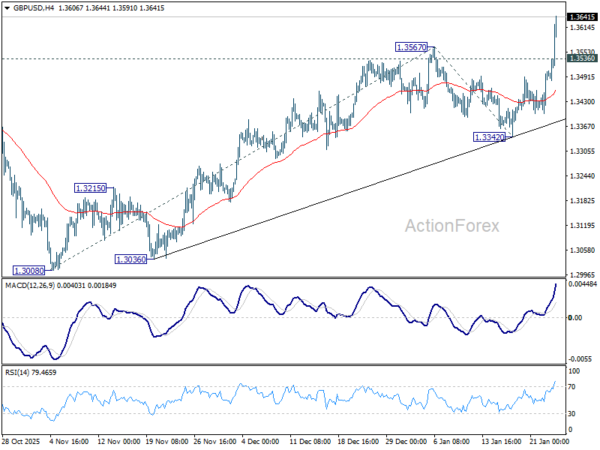 GBP/USD ‘s rise from 1.3008 resumed last week by breaking through 1.3567 short term top decisively. Initial bias stays on the upside this week for retesting 1.3787 high. Firm break there will confirm larger up trend resumption. On the downside, below 1.3536 minor support will turn intraday bias neutral. But retreat should be contained well above 1.3342 support to bring another rally.
