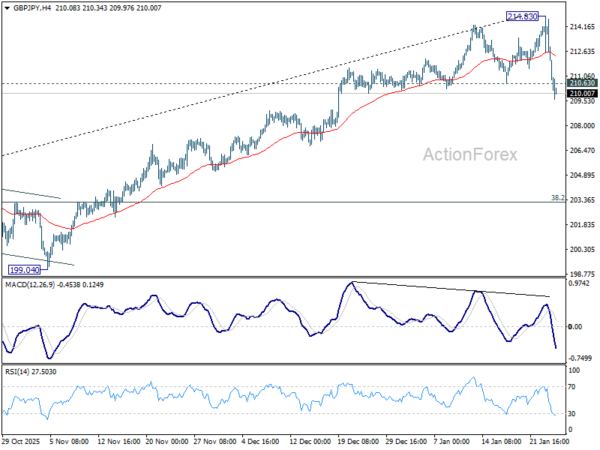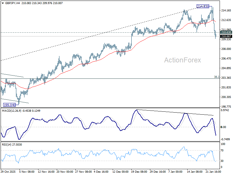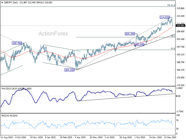 GBP/JPY’s break of 210.63 support indicates that a short term top was at least formed at 214.83. Intraday bias is back on the downside for 55 D EMA (now at 208.90). Sustained break there will argue that it’s correcting whole rise from 184.35 and target 38.2% retracement of 184.35 to 214.83 at 203.18. For now, risk will stay on the downside as long as 214.83 holds, in case of recovery.