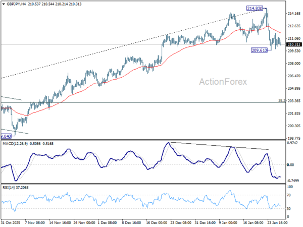 Intraday bias in GBP/JPY is turned neutral for consolidations above 209.61 temporary low. Risk will stay on the downside as long as 214.83 holds, even in case of strong recovery. Below 209.61, and sustained break of 55 D EMA (now at 209.00) will argue that it’s correcting whole rise from 184.35 and target 38.2% retracement of 184.35 to 214.83 at 203.18.