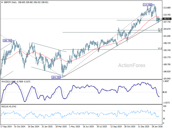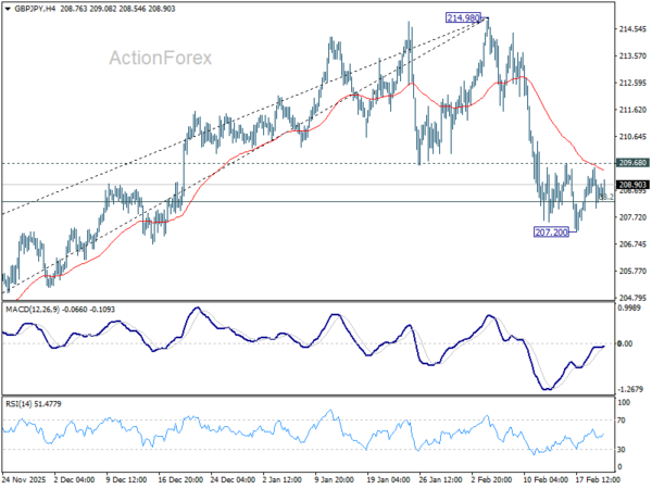 Intraday bias in GBP/JPY stays neutral at this point and outlook is unchanged. On the downside, sustained break of 38.2% retracement of 197.47 to 214.98 at 208.29 will suggest that larger scale correction is already underway and target 203.27 fibonacci level. Nevertheless, strong rebound from current level, followed by break of 210.47 minor resistance will retain near term bullishness, and bring retest of 214.83/98 resistance zone.