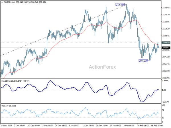 GBP/JPY edged lower to 207.20 last week but quickly recovered. Initial bias stays neutral this week first. On the downside, break of 207.20 will extend the corrective fall from 214.98 to 38.2% retracement of 184.35 to 214.98 at 203.27. Nevertheless, firm break of 209.68 will turn bias back to the upside for stronger rebound first.