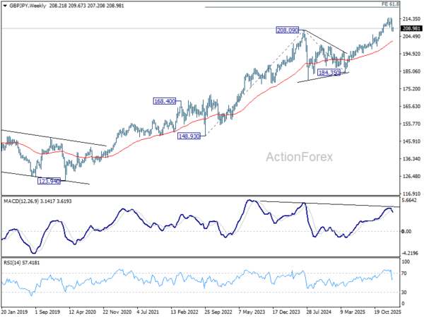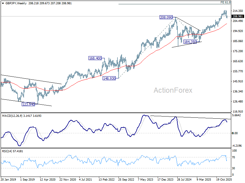 In the bigger picture, considering the break of 55 D EMA (now at 209.96), a medium term top could be formed at 214.98. Deeper correction would be seen, but downside should be contained by 38.2% retracement of 184.35 to 214.98 at 203.27. On the upside, break of 214.98 will resume larger up trend from from 123.94 (2020 low), and target 61.8% projection of 148.93 (2022 low) to 208.09 (2024 high) from 184.35 at 220.90.