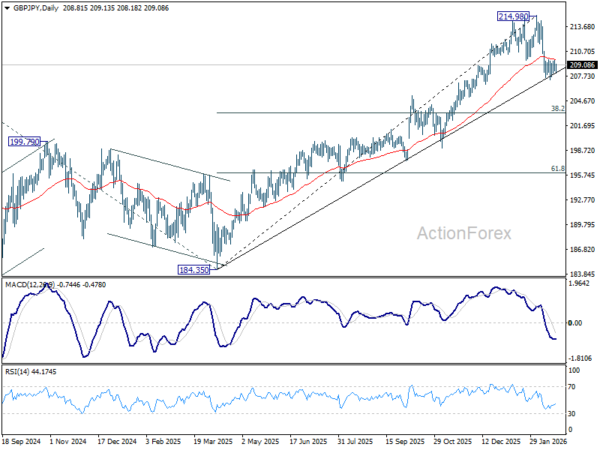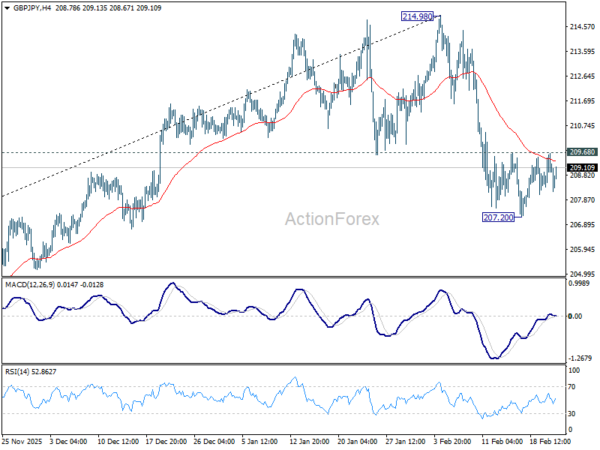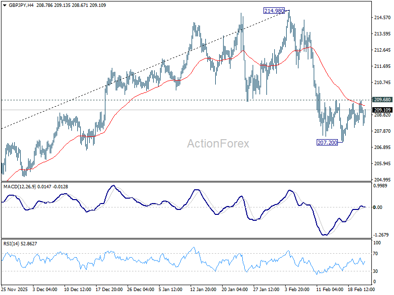 Intraday bias in GBP/JPY remains neutral as range trading continues. On the downside, break of 207.20 will extend the corrective fall from 214.98 to 38.2% retracement of 184.35 to 214.98 at 203.27. Nevertheless, firm break of 209.68 will turn bias back to the upside for stronger rebound first.