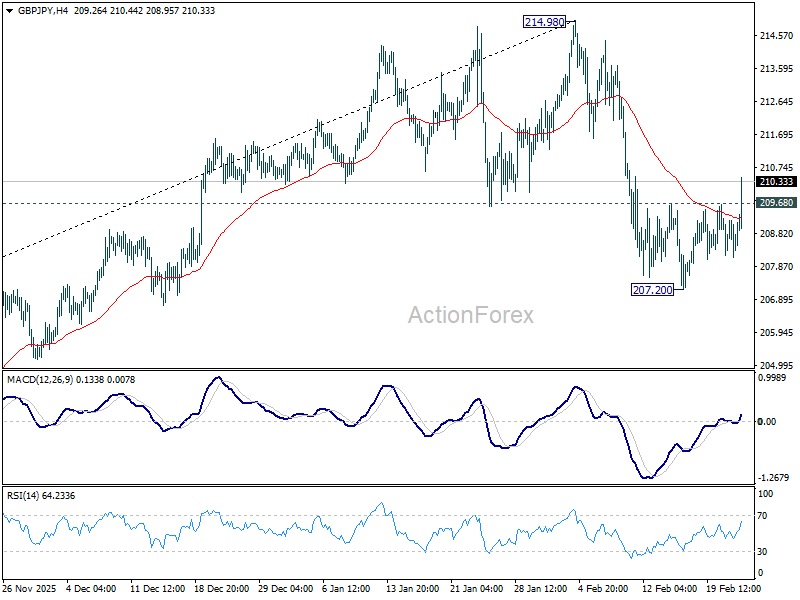 GBP/JPY’s strong break of 209.68 minor resistance suggests that pullback from 214.98 has completed at 207.20 already. Intraday bias is back on the upside. Further rise should be seen to retest 214.98 first. Firm break there will resume larger up trend. For now, risk will stay on the upside as long as 207.20 holds, in case of retreat.