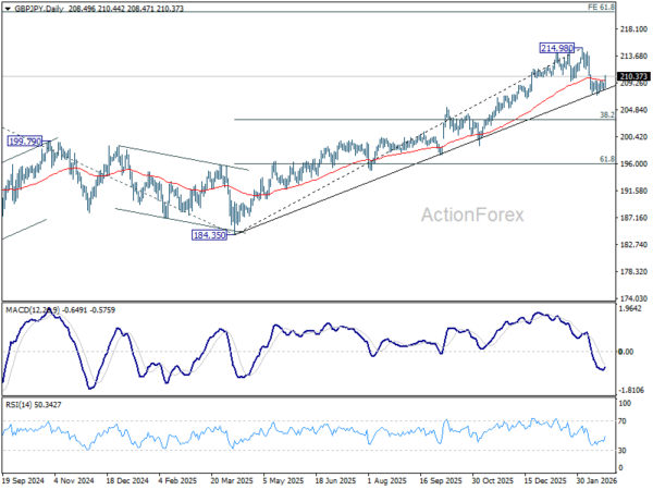 In the bigger picture, current development argues that price actions from 214.98 might be a near term consolidation pattern only. That is, larger up trend from 123.94 (2020 low) is still in progress. Firm break of 214.98 will target 61.8% projection of 148.93 (2022 low) to 208.09 (2024 high) from 184.35 at 220.90. On the downside, though, break of 207.20 will revive that case that it’s already in a larger scale correction.