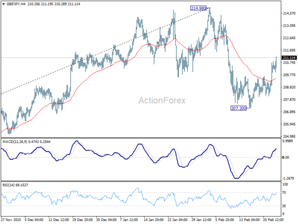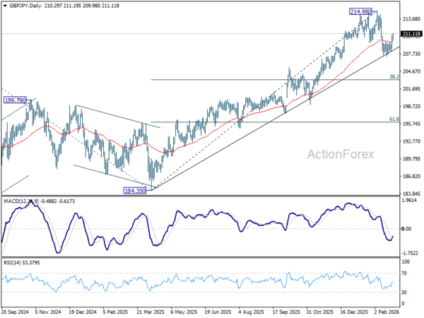 Intraday bias in GBP/JPY remains on the upside for the moment. Pull back from 214.98 has completed as a near term correction at 207.20. Further rise would be seen to retest 214.98 first. Firm break there will resume larger up trend. For now, risk will stay on the upside as long as 207.20 holds, in case of retreat.