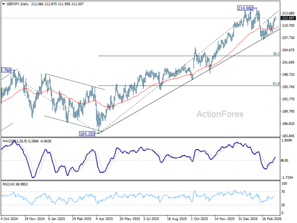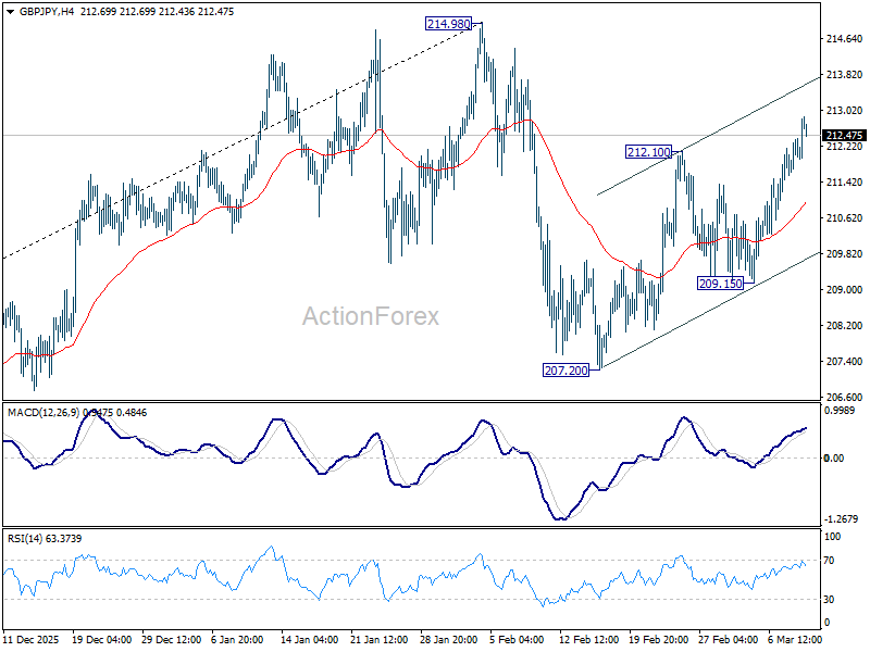 GBP/JPY’s rebound from 207.20 resumed by breaking through 212.10 and intraday bias is back on the upside for retesting 214.98 high. Firm break there will resume larger up trend. On the downside, though, break of 209.15 will extend the corrective pattern from 214.98 with another falling leg, and target 207.20 support.