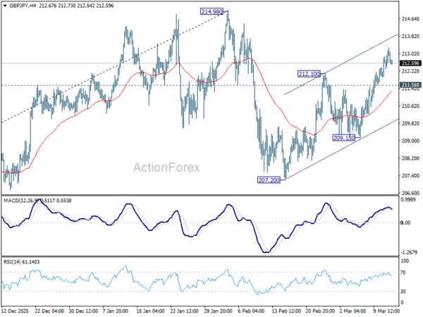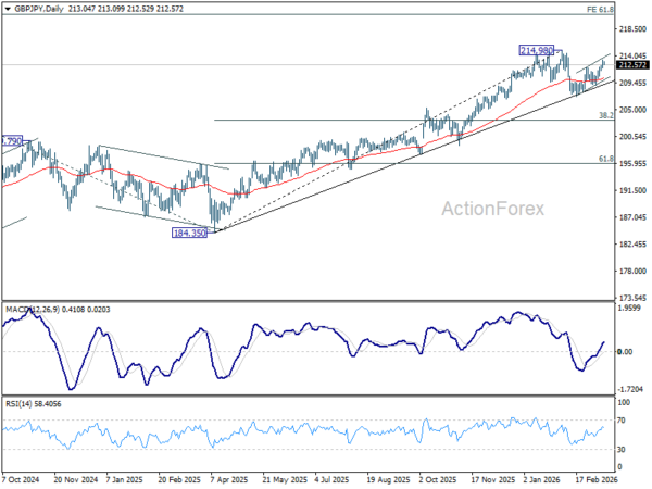 Intraday bias in GBP/JPY remains mildly on the upside at this point. Rise from 207.20 should continue to retest 214.98 high. Firm break there will resume larger up trend. On the downside, below 211.56 minor support will turn intraday bias neutral first. Further break of 209.15 will extend the corrective pattern from 214.98 with another falling leg, and target 207.20 support.