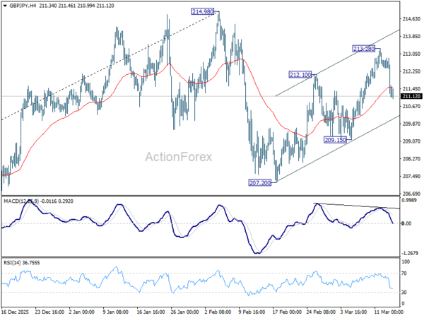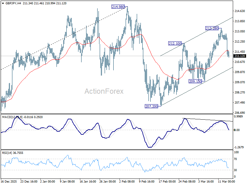 GBP/JPY rose further to 213.28 last week. But subsequent selloff from there argue that the rebound fro 207.20 has completed as a three-wave corrective move. Initial bias is mildly on the downside this week for 209.15. Firm break there will solidify this case and target 207.20 next. On the upside, however, above 213.28 will target a retest on 214.98 high instead.