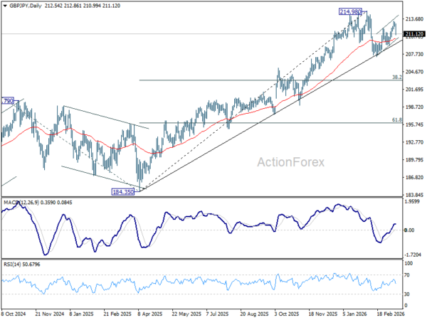 In the bigger picture, up trend from 123.94 (2020 low) is still in progress. Firm break of 214.98 will target 61.8% projection of 148.93 (2022 low) to 208.09 (2024 high) from 184.35 at 220.90. This will remain the favored case as long as 55 W EMA (now at 202.80) holds, even in case of another deep pullback.