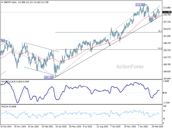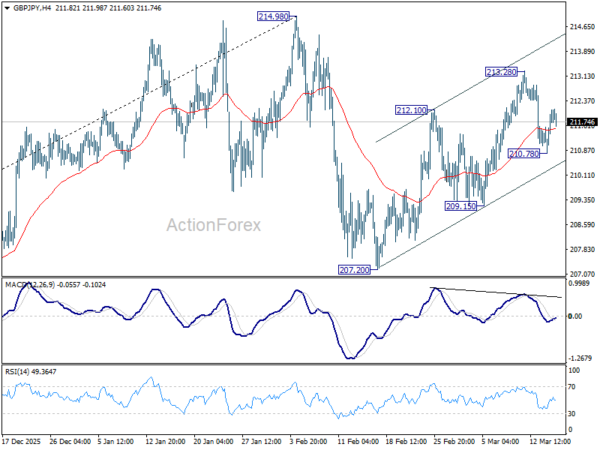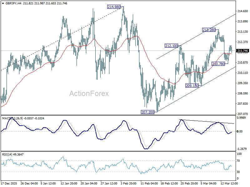 Intraday bias in GBP/JPY is turned neutral first with current recovery. Outlook is unchanged that rebound from 207.20 could have completed with three waves up to 213.28. Below 210.78 will target 209.15 support first. Firm break there will solidify this case and target 207.20 next. On the upside, however, above 213.28 will target a retest on 214.98 high instead.