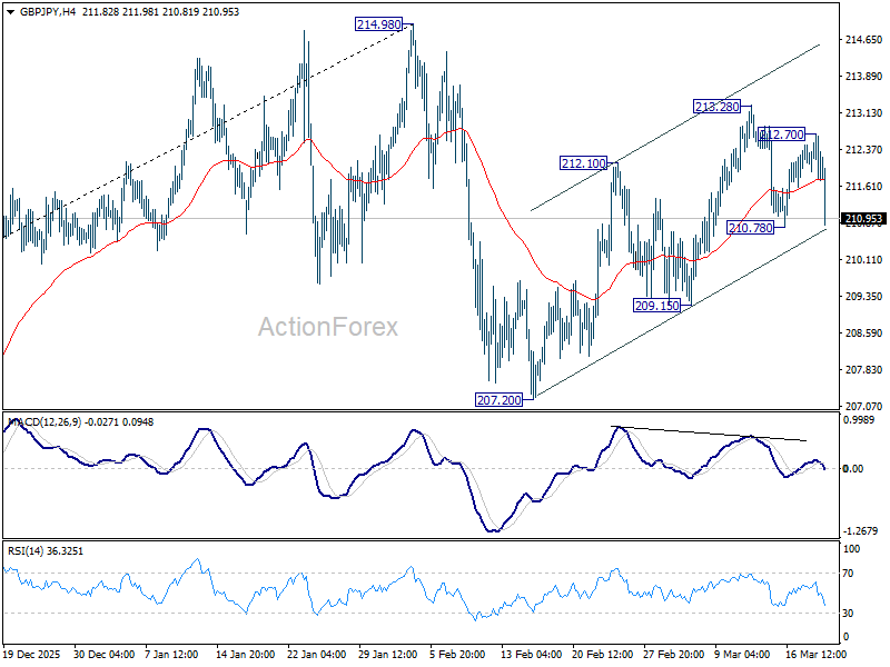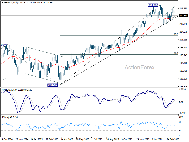 Daily Pivots: (S1) 211.66; (P) 212.19; (R1) 212.49; More…