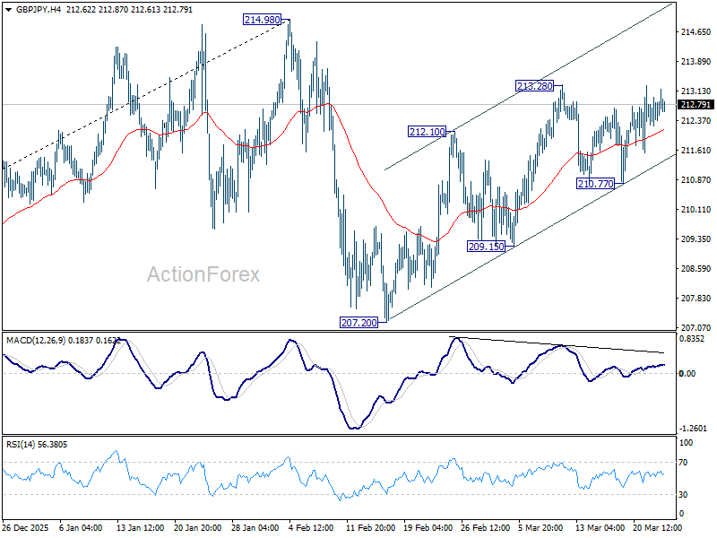 Intraday bias in GBP/JPY remains mildly on the upside at this point. Firm break of 213.28 resistance will resume the rally from 207.20 and target a retest on 214.98 high. For now, risk will stay mildly on the upside as long as 210.77 support holds, in case of retreat.