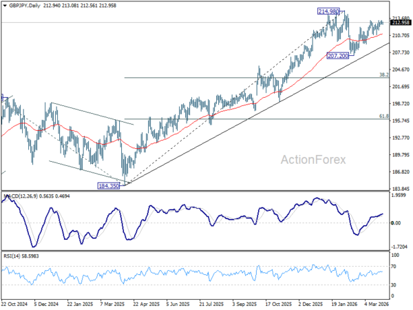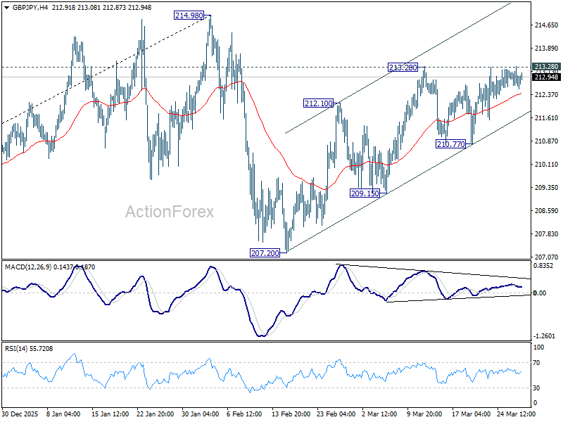 Intraday bias in GBP/JPY is turned neutral first with current retreat. On the upside, firm break of 213.28 resistance will resume the rally from 207.20 and target a retest on 214.98 high. However, break of 210.77 will turn bias back to the downside for 209.15 support.