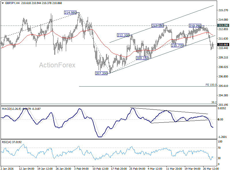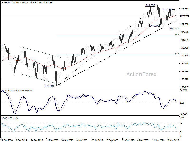 Intraday bias in GBP/JPY stays on the downside at this point. Corrective pattern from 214.98 should be in the third leg. Deeper decline would be seen to 209.15. Firm break there will target 207.20 and below. For now, risk will stay on the downside as long as 213.29 resistance holds, in case of recovery.
