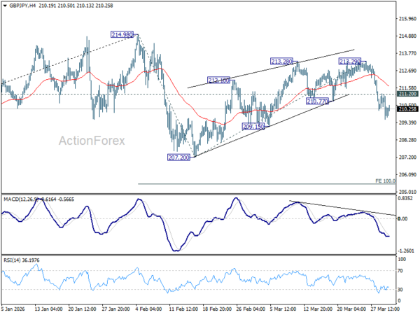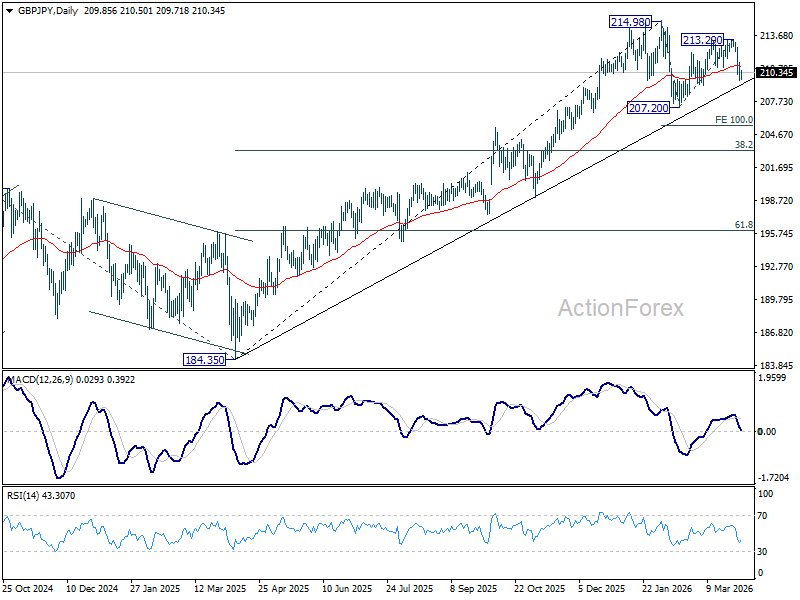 No change in GBP/JPY’s outlook and intraday bias stays on the downside. Corrective pattern from 214.98 should be in the third leg. Deeper decline would be seen to 209.15. Firm break there will target 207.20 and below. On the upside, above 211.20 minor resistance will turn bias neutral first. But risk will stay on the downside as long as 213.29 resistance holds, in case of recovery.