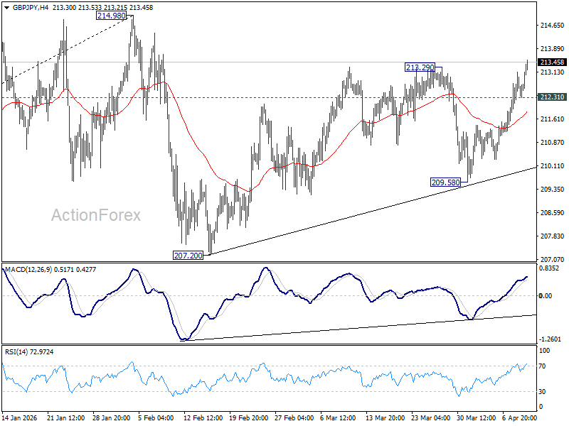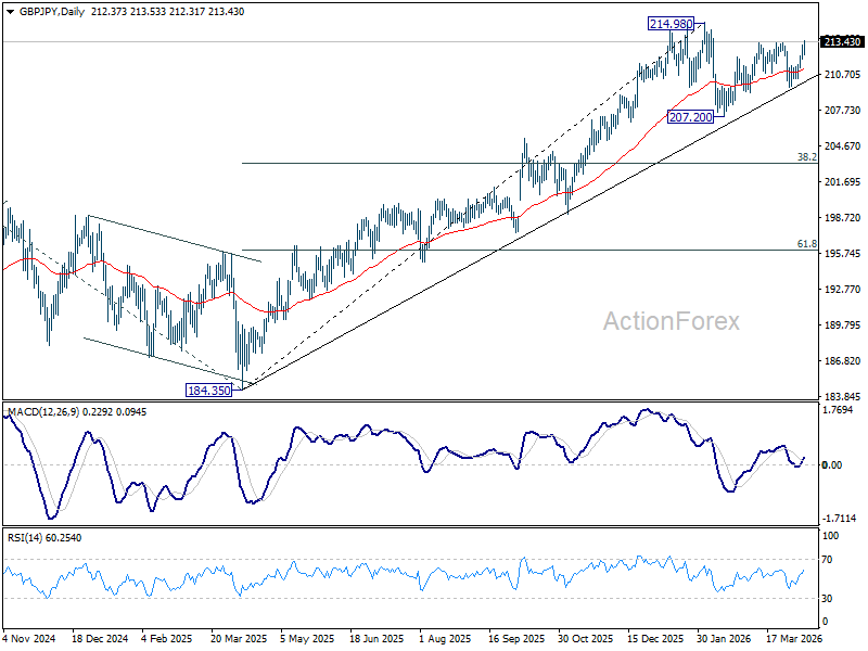 GBP/JPY’s rise from 207.20 resumed by breaking 213.29 resistance and intraday bias is back on the upside. Further rise should be seen to retest 214.98 high. On the downside, below 212.31 minor support will turn bias neutral first. But risk will now remain on the upside as long as 209.58 support holds, in case of retreat.