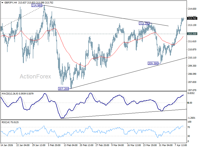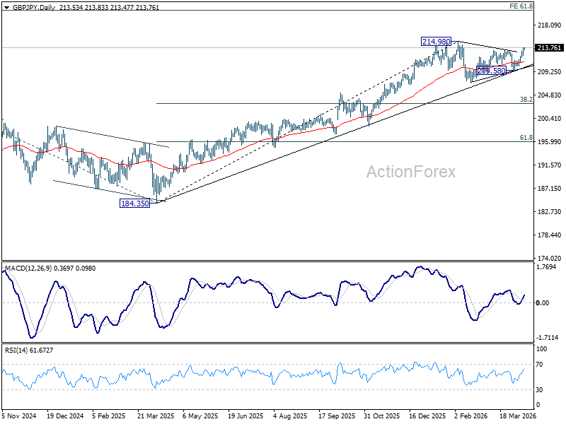Intraday bias in GBP/JPY remains on the upside for retesting 214.98 high. Decisive break there will confirm larger up trend resumption. On the downside, below 212.31 minor support will turn bias neutral first. But risk will now remain on the upside as long as 209.58 support holds, in case of retreat.