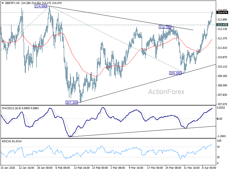 GBP/JPY’s strong rally last week suggests that consolidation from 214.98 might have completed at 209.58, and larger up trend is resuming. Initial bias stays on the upside for retesting 214.98 first. Firm break there will confirm and target 61.8% projection of 199.04 to 214.98 from 209.58 at 219.43. On the downside, below 213.47 minor support will delay the bullish case, and turn intraday bias neutral again first.