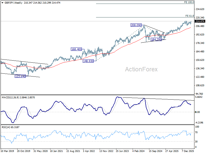 In the bigger picture, up trend from 123.94 (2020 low) is still in progress. Firm break of 214.98 will target 61.8% projection of 148.93 (2022 low) to 208.09 (2024 high) from 184.35 at 220.90. This will remain the favored case as long as 55 W EMA (now at 204.10) holds, even in case of another deep pullback.