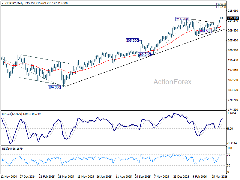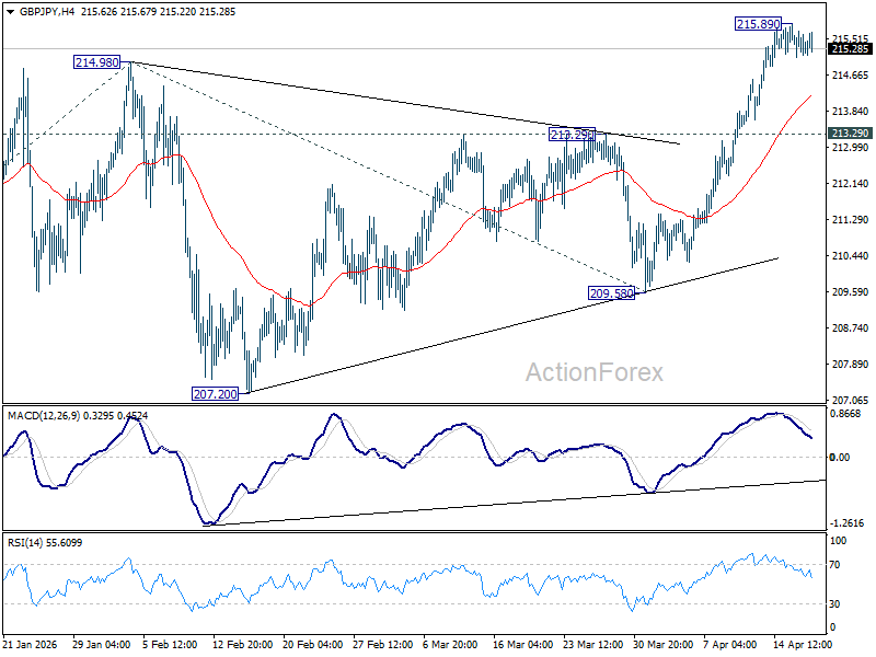 Intraday bias in GBP/JPY stays neutral for consolidations below 215.89 temporary top. Downside of retreat should be contained by 213.29 resistance turned support to bring another rally. On the upside, break of 215.89 will resume larger up trend to 61.8% projection of 199.04 to 214.98 from 209.58 at 219.43.