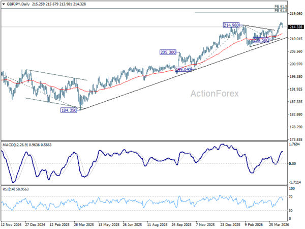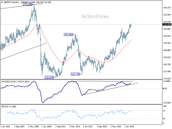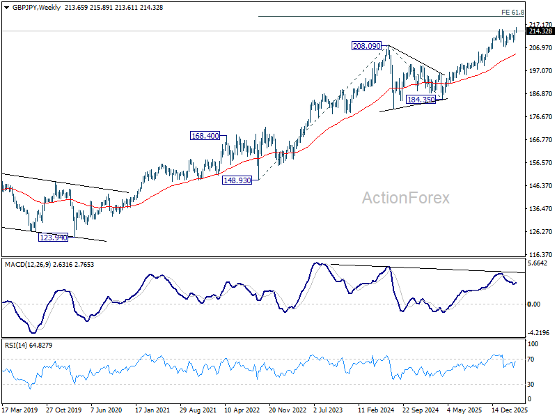 In the bigger picture, up trend from 123.94 (2020 low) is still in progress. Firm break of 214.98 will target 61.8% projection of 148.93 (2022 low) to 208.09 (2024 high) from 184.35 at 220.90. This will remain the favored case as long as 55 W EMA (now at 204.10) holds, even in case of another deep pullback.