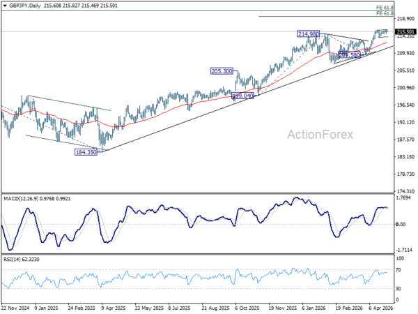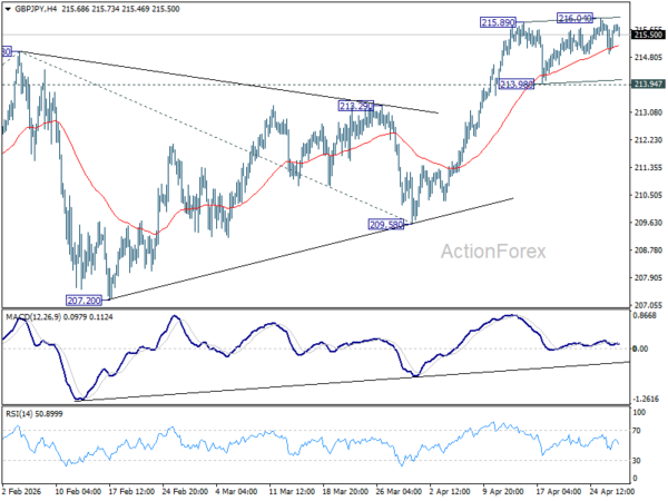 Intraday bias in GBP/JPY stays neutral and more consolidations could be seen. Further rise is expected as long as 213.94 r support holds. On the upside, firm break of 216.04 will resume larger up trend to 61.8% projection of 199.04 to 214.98 from 209.58 at 219.43.