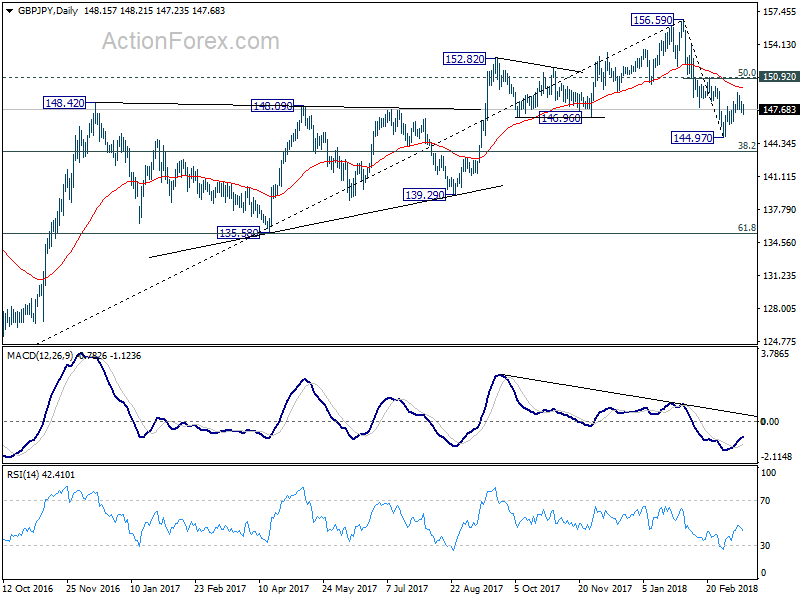 GBP/JPY’s recovery from 144.97 extended higher to 149.36 last week but retreated since then. As it’s staying above 146.34 minor support, initial bias remains neutral this week first. In case of another rise, upside should be limited by 150.92 (50% retracement of 156.59 to 144.97 at 150.78 to bring fall resumption. On the downside, below 146.34 minor support will suggest that the recovery has completed. Intraday bias will then be turned back to the downside for 144.97 first. Break will extend the decline from 156.59 to 143.51 medium term fibonacci level next.