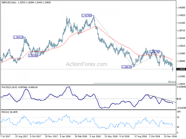 Despite today’s recovery, with 1.2651 minor resistance intact, intraday bias remains on the downside. Prior break of 1.2661 support confirmed resumption of down trend from 1.4376. Further fall should be seen to 61.8% projection of 1.4376 to 1.2661 from 1.3174 at 1.2114. On the upside, above 1.2651 minor resistance will turn intraday bias neutral and bring consolidation first, before staging another decline.