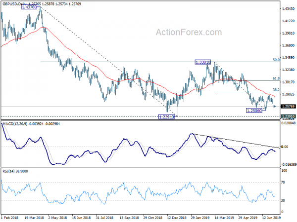 In the bigger picture, down trend from 1.4376 (2018 high) is still in progress. Break of 1.2391 would target a test on 1.1946 long term bottom (2016 low). For now, we don’t expect a firm break there yet. Hence, focus will be on bottoming signal as it approaches 1.1946. In any case, medium term outlook will stay bearish as long as 1.3381 resistance holds, in case of strong rebound.