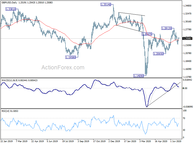 Intraday bias in GBP/USD stays neutral for the moment. As long as 1.2587 resistance holds, further decline remains mildly in favor. Below 1.2334 temporary will target 1.2065 support first. Firm break there will confirm completion of rebound from 1.1409 at 1.2813. However, break of 1.2587 will dampen this bearish view and bring retest of 1.2813 high instead.