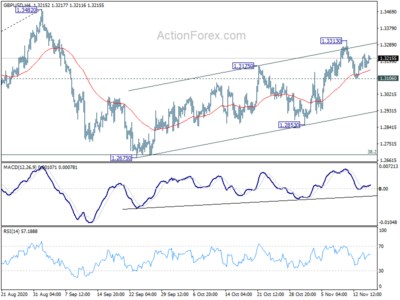 Intraday bias in GBP/USD remains as consolidation from 1.3313 temporary top is still extending. Further rise remains mildly in favor. On the upside, break of 1.3313 will target a test on 1.3482 high. However, sustained break of 1.3106 will argue that the rebound from 1.2675 has completed. Intraday bias will be turned back to the downside for 1.2853 support.
