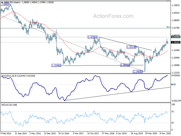 In the bigger picture, rise from 1.1409 medium term bottom is in progress. Further rally would be seen to 1.4376 resistance and above. Decisive break there will carry larger bullish implications and target 38.2% retracement of 2.1161 (2007 high) to 1.1409 (2020 low) at 1.5134. On the downside, break of 1.3482 resistance turned support is needed to be first indication of completion of the rise. Otherwise, outlook will stay cautiously bullish even in case of deep pullback.
