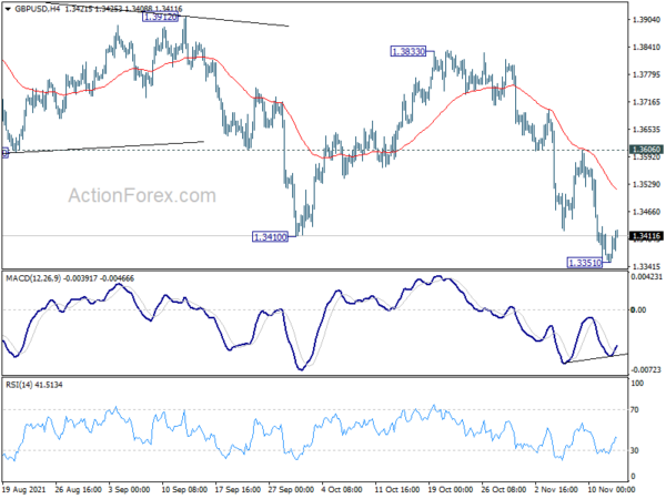 GBP/USD dropped to 1.3351 last week and break of 1.3410 low confirmed resumption of whole fall from 1.4248. But as a temporary low was formed, initial bias is neutral this week first. Upside of recovery should be limited below 1.3606 resistance to bring another fall. Break of 1.3351 will turn bias back to the downside for 1.3164 fibonacci level.